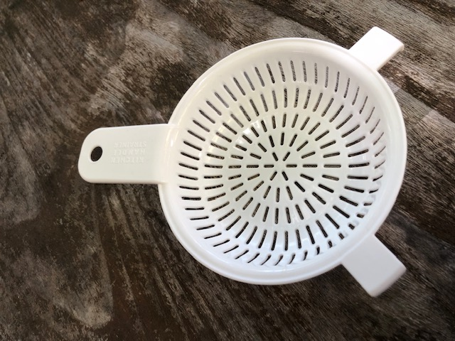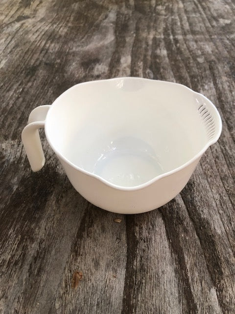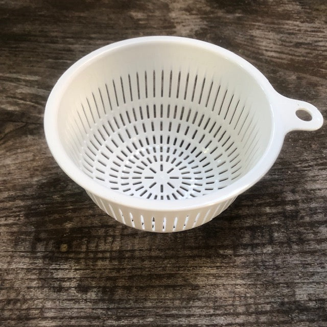The deep white strainer has a diameter of 14 cms and is 7.5 cms deep.