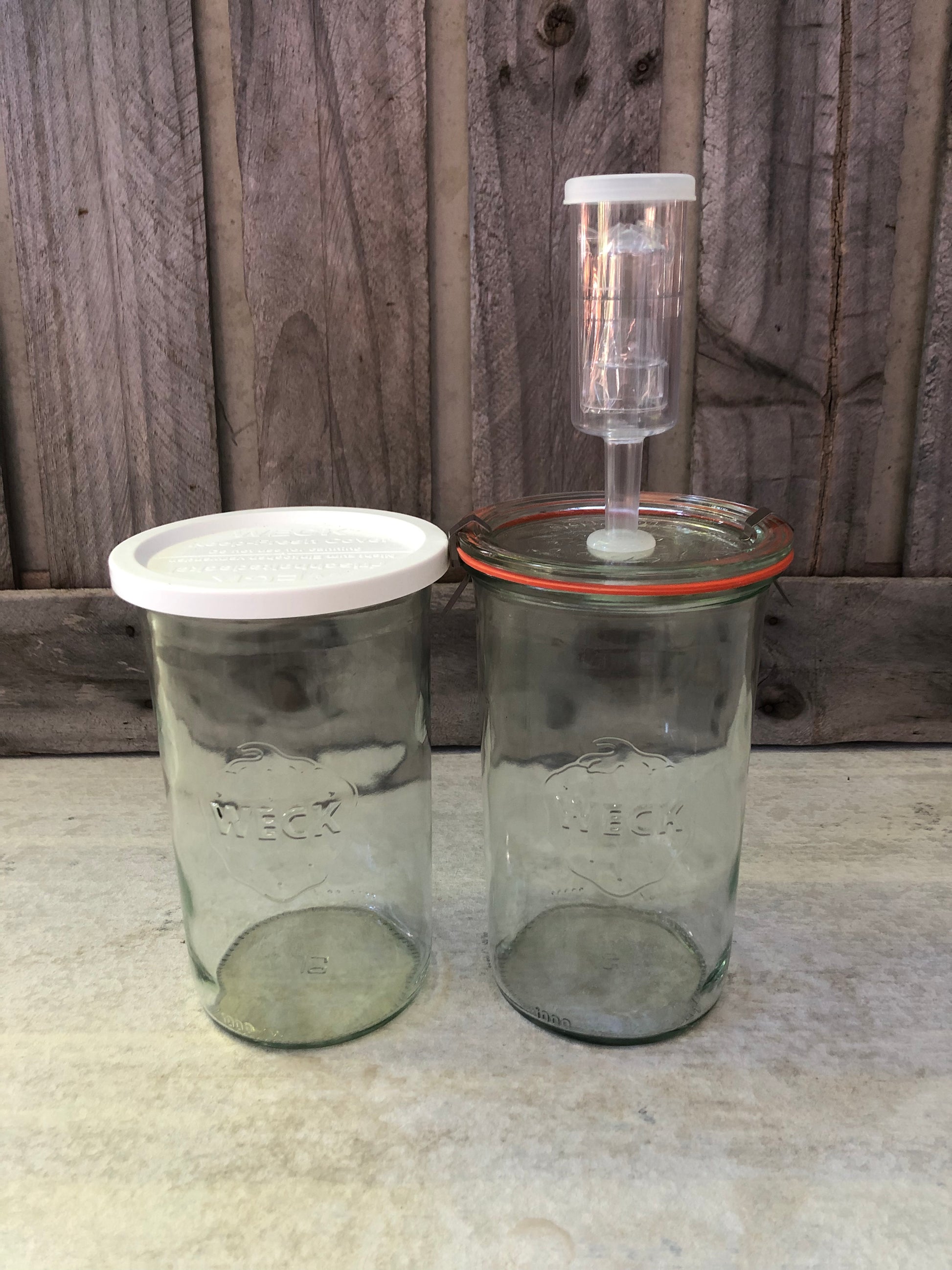 One jar fitted with airlock and the second jar comes with a snap on storage lid. Ferment in the first jar and when your ferment is ready to go into the fridge replace the airlock lid with the snap on storage lid. Your airlock lid is then free to use on the second jar. Using this method you can always have a jar of sauerkraut in the fridge for consumption and your next batch will be fermenting on the bench.
